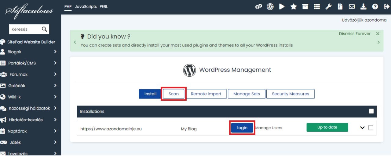 Ha esetleg nem jelenik meg a telepített wordpress oldal, azonban tudja, hogy telepítésre került, kérem kattintson a Scan gombra!